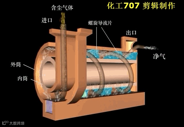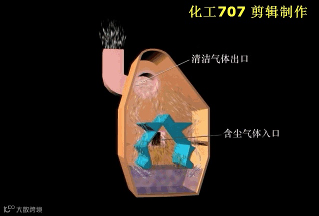 含尘气流由进气管进入筒内,沿内壁螺旋式向下旋转,粉尘在离心力的作用下甩向器壁,并在重力作用下落入灰斗,已净化气体由中心管排出。