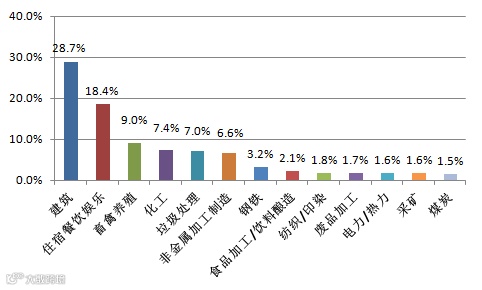 从全国举报行业情况来看,建筑、住宿餐饮娱乐、畜禽养殖、化工、垃圾处理、非金属加工制造等行业举报最多,六个行业举报量合计占到全国举报量的77.2%。