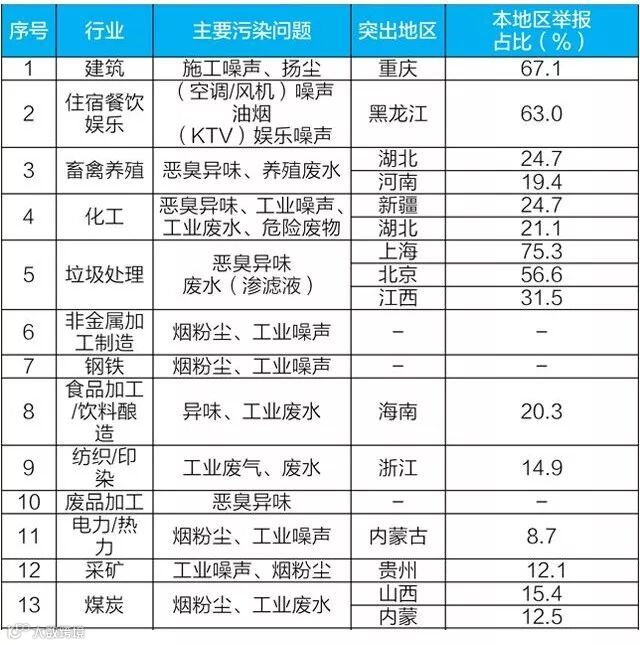 受产业结构、管理水平等方面影响,各地主要举报行业差异较大。其中,重庆建筑业、黑龙江住宿餐饮娱乐业、上海和北京垃圾处理业举报占本省(市)举报量的一半以上,超过全国平均值一倍。湖北畜禽养殖业、新疆化工业、海南食品加工/饮料酿造业举报超过全国平均值约15个百分点。此外,浙江纺织印染业、贵州采矿业、山西和内蒙古煤炭业举报也相对突出。