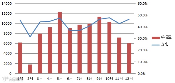 图6 各月烟粉尘举报量及占比变化图