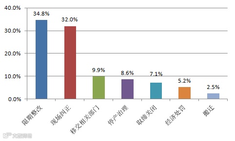 从查处情况来看,受理的举报中属实比例约为七成,与往年持平。对于举报属实的处理意见中,对企业下达限期整改和现场纠正的占比最多,分别为34.8%和32%。
