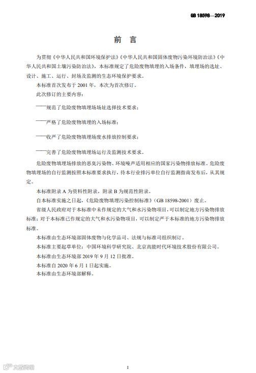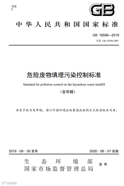 该标准自2020年6月1日起实施,自实施之日起,《危险废物填埋污染控制标准》(GB18598-2001)同时废止。