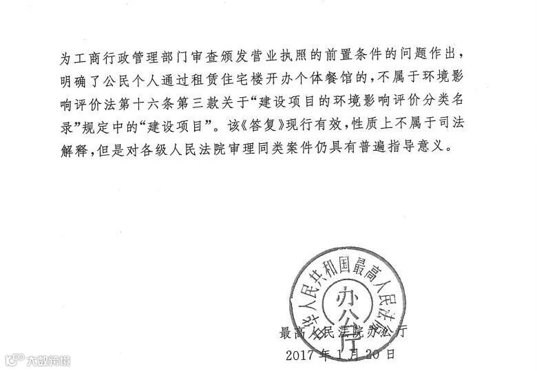 该《答复》是针对福建省高级人民法院请示的环评审批应否作为工商行政管理部门审查颁发营业执照的前置条件的问题作出,明确了公民个人通过租赁住宅楼开办个体餐馆的,不属于环境影响评价法第十六条第三款关于“建设项目的环境影响评价分类名录”规定中的“建设项目”。该《答复》现行有效,性质上不属于司法解释,但是对各级人民法院审理同类案件仍具有普遍指导意义。