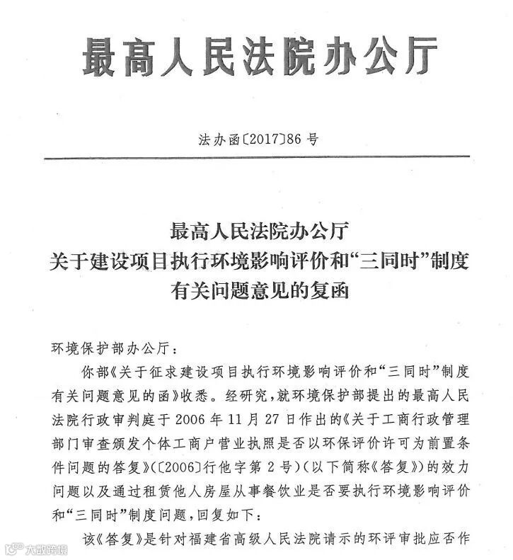 附件:《最高人民法院办公厅关于建设项目执行环境影响评价和“三同时”制度有关问题意见的复函》(法办函〔2017〕86号)