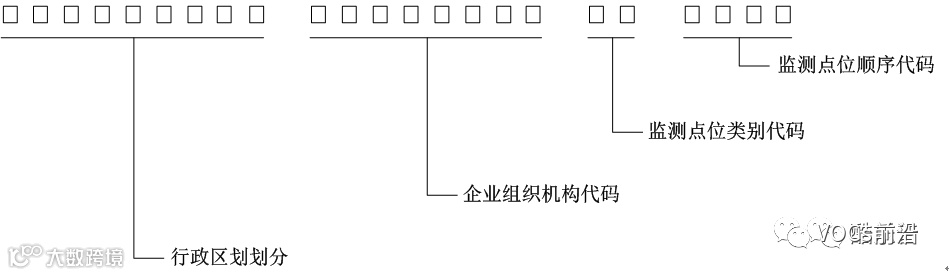 监测点位编码由四部分组成,如图B.1,分别为行政区划代码、企业组织机构代码、监测点位类别代码和监测点位顺序代码。第一部分编码表示监测点位所在地的行政区划代码,详细至街道、镇、乡一级,用9位阿拉伯数字表示,根据DB37/T 010确定;第二部分编码表示企业组织机构代码,用8位本体代码表示,根据GB 11714确定;第三部分编码表示废气监测点位类别代码,用2位大写英文字母表示,“FQ”表示“废气”;第四部分编码表示监测点位顺序代码,用4位阿拉伯数字表示,即0001-9999,且监测点位顺序代码在第一部分和第二部分编码相同时不重复使用,由地方环境保护行政主管部门规定。