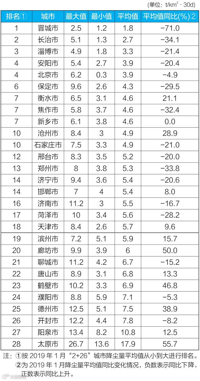 2019年1月京津冀大气污染传输通道“2+26”城市降尘监测结果