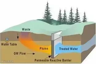 原理:在地下安装透水的活性材料墙体拦截污染物羽状体,当污染羽状体通过反应墙时,污染物在可渗透反应墙内发生沉淀、吸附、氧化还原、生物降解等作用得以去除或转化,从而实现地下水净化的目的。