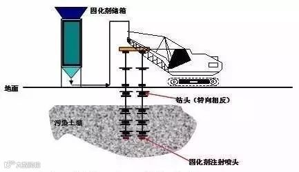 原理:通过一定的机械力在原位向污染介质中添加固化剂/稳定化剂,在充分混合的基础上,使其与污染介质、污染物发生物理、化学作用,将污染土壤固封为结构完整的具有低渗透系数的固化体,或将污染物转化成化学性质不活泼形态,降低污染物在环境中的迁移和扩散。