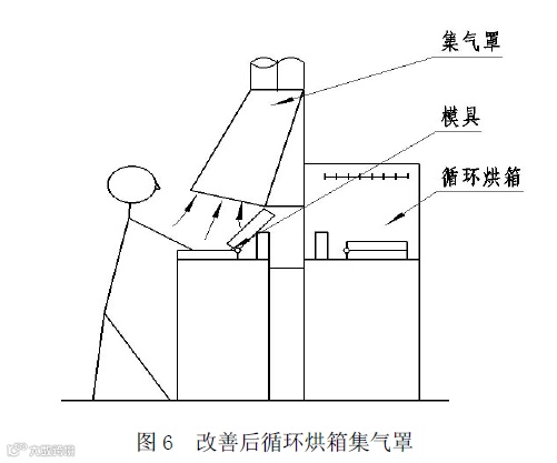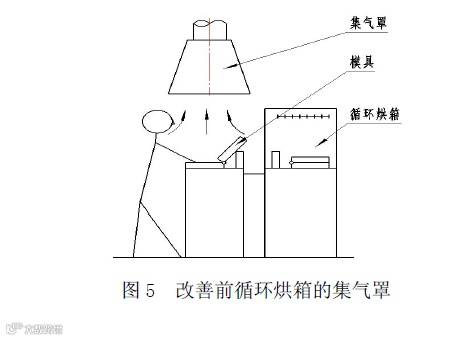 图5为循环烘箱工件脱模工序的集气罩结构,经加热后的化工制品及模具离型剂,产生了大量的有害气体,为了有效吸气和不妨碍工人操作,将集气罩置于工作台的正上方,罩口距离较远,这样不仅增大了罩口的吸气范围,而且容易受到室内其他气流干扰,同时在污染气体抽吸入罩口过程,经过操作人员的口、鼻,直接危害工人的健康。