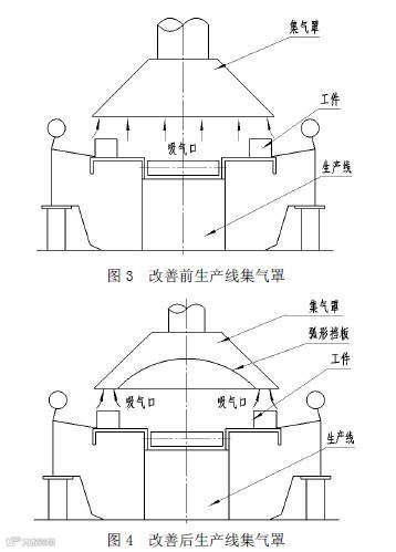 若将其设计改为如图4所示,即在罩内加装弧形挡板,使整体大罩口被分隔成小罩口,对准工件(污染源)上方,这样大大减小了罩口面积A,相应排风量Q减小,使用较小的吸风量即有效的控制了污染气体的逸出,产生了较好效益。