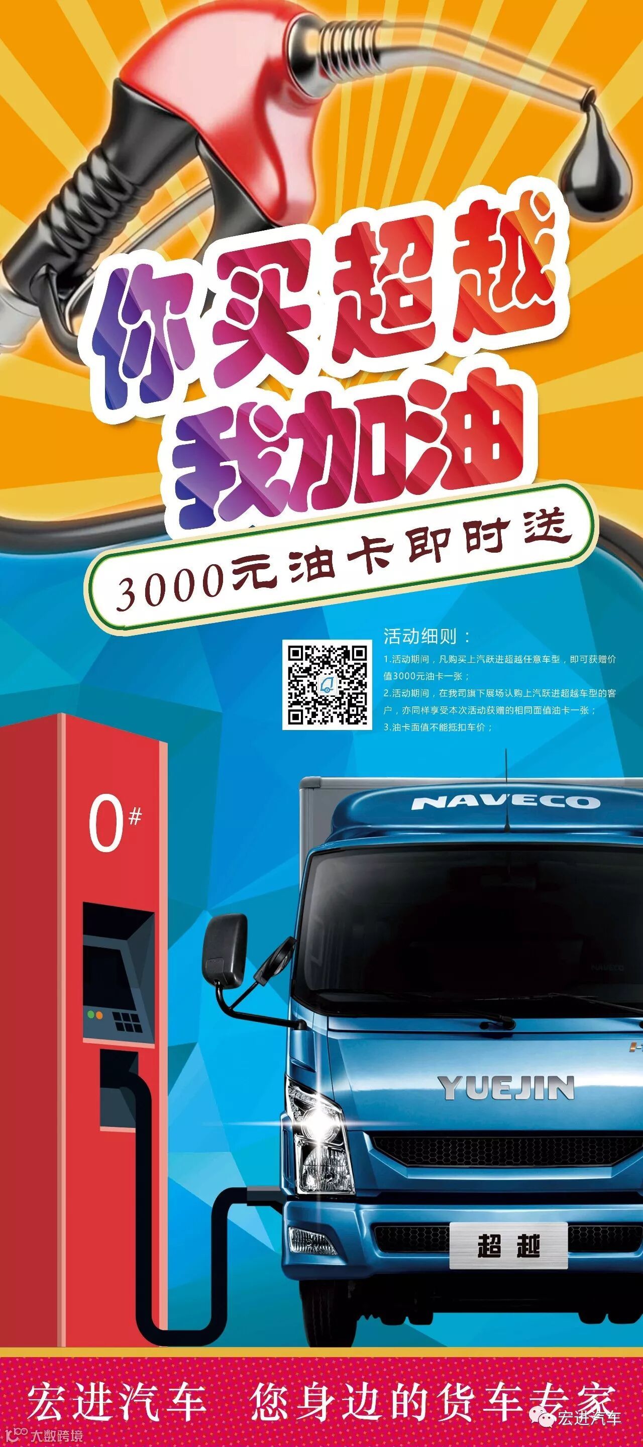 为了感谢各大车主对我司品牌货车超越系列的支持,我司决定在12月1日在车队客服中心正门广场举行《超越拍档之您开超越,我来加油》活动,届时凡在活动期间 销售的跃进超越车系均享受 3000元油卡/台次(注意:油卡不能与车价相抵),本活动优惠就在明天,赶紧来参与起来吧!!!