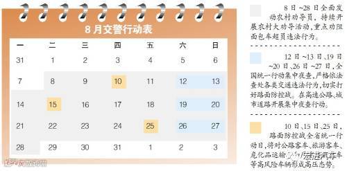 为掀起整治专项行动的高潮,8月10日、15日、25日为路面防控战全省统一行动日,交警部门将紧紧围绕公路客车、旅游客车、危化品运输车和严重超载货车等高风险车辆,根据本地区事故规律特点和多发区域路段,明确重点时段、重点路段,最大限度把警力摆到路面,形成严管高压态势。