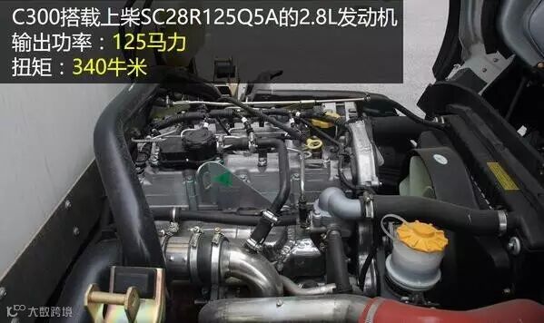 我们常说发动机是汽车的“心脏”,升级后的超越C300搭载的是型号为上柴SC28R125Q5A的四缸发动机,排量为2.771L,最大功率输出125马力,发动机转速在1600-2400rpm时可释放340牛·米的峰值扭矩。相比于市面上其它国五轻卡所采用的发动机,如康明斯2.8发动机和江铃发动机,上柴这款发动机的功率输出要略胜一筹。