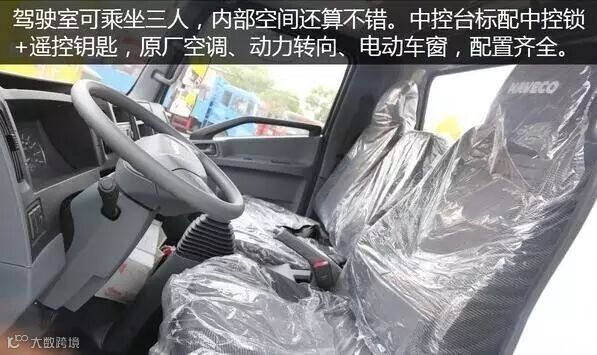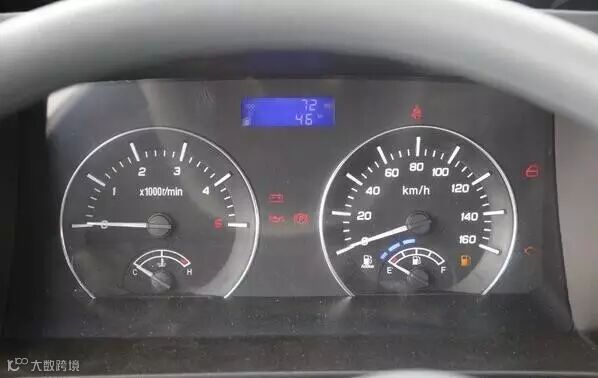 仪表盘采用了传统指针与断码LED的组合方式,可显示转速、时速和公里数等信息。在右边的车速表下方还有两个小表,其中靠上一点蓝色部分是Adblue尿素表,着是国五排放轻卡独有的配置。