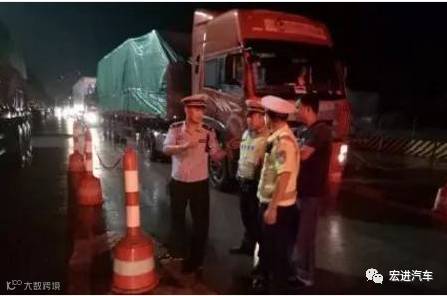 9月5日凌晨,山东泰安交警赶着小雨将20余辆超载大货车全部拿下