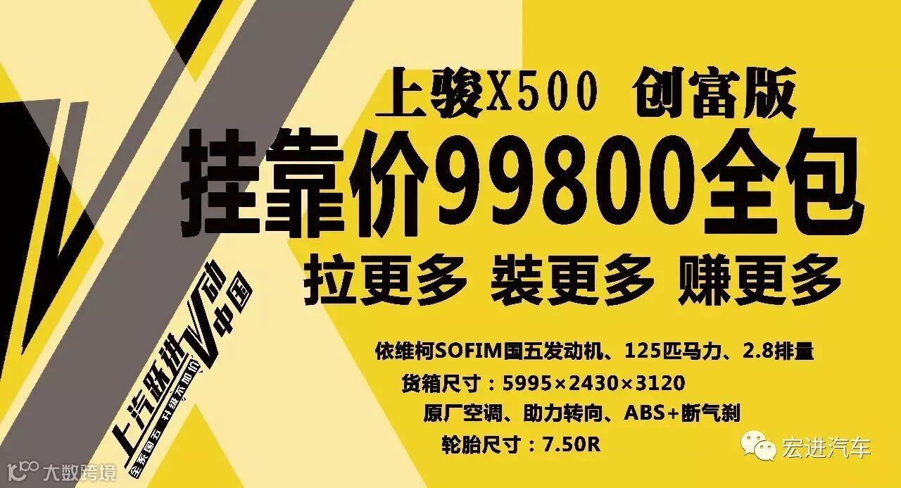 司机朋友们你们好,宏进汽车店长推荐车型上骏X500一价到底,感恩惠给你。恩将“酬”报。上骏X500 创富版,挂靠价99800全包,拉更多,装更多,赚更多。走过路过的朋友们,司机们,进了看一看,不买没关系,看看也欢迎,买的你心动,亏得我心疼,机会不多,请抓紧时间,速来抢。