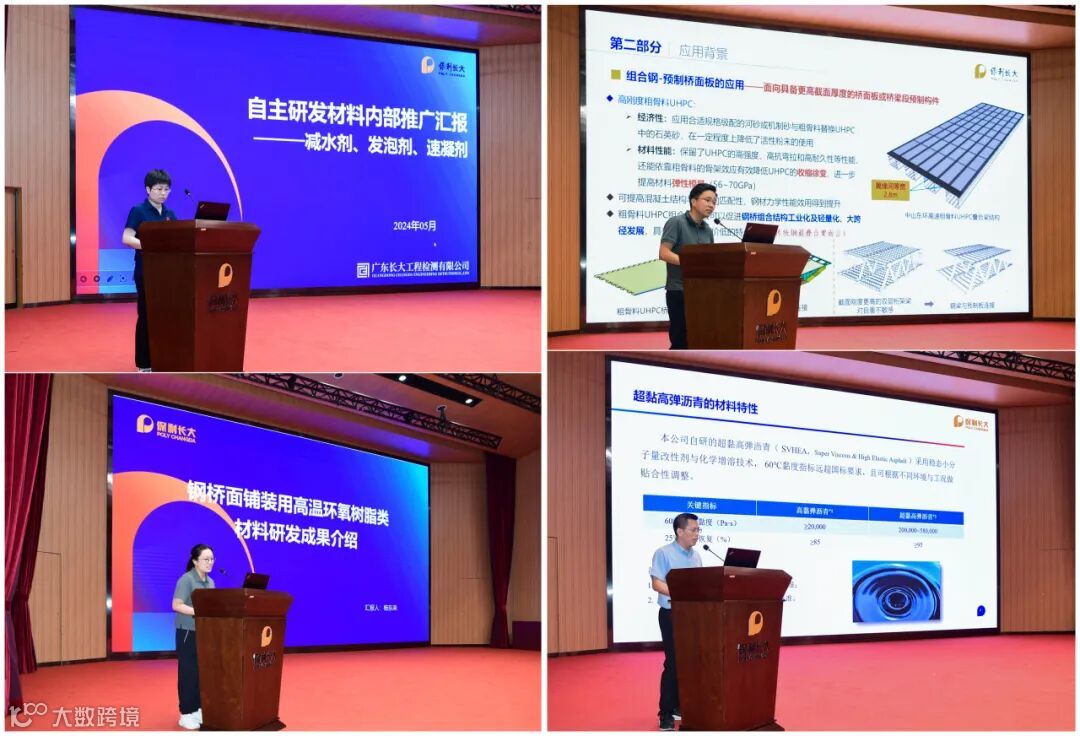 在产品介绍环节,长大检测公司介绍了减水剂、发泡剂和速凝剂等三款自主研发材料产品的相关室内试验和项目应用情况。对比市场成熟产品,该三款自研材料性能及成本均具备优势,适合进一步推广应用于实体工程。