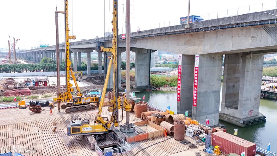 海隆大桥主墩桩基共42根(小榄水道桥26根,鸡鸦水道桥16根),本次开钻为小榄水道桥的Z3-3号桩,桩长约68m,单桩设计混凝土方量483m³,主墩基础将采用直径3m的钻孔灌注桩。由于施工区域地质情况复杂、粉质黏土等软弱覆盖层厚度超过30m且新桥桩基毗邻旧桥及河堤,本次施工通过采取36m长钢护筒、优化CMC泥浆配比等措施,防止对旧桥及河堤造成扰动。