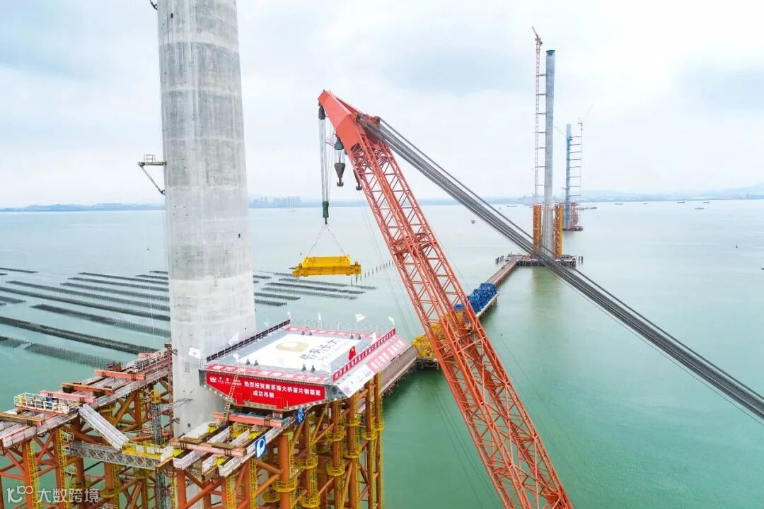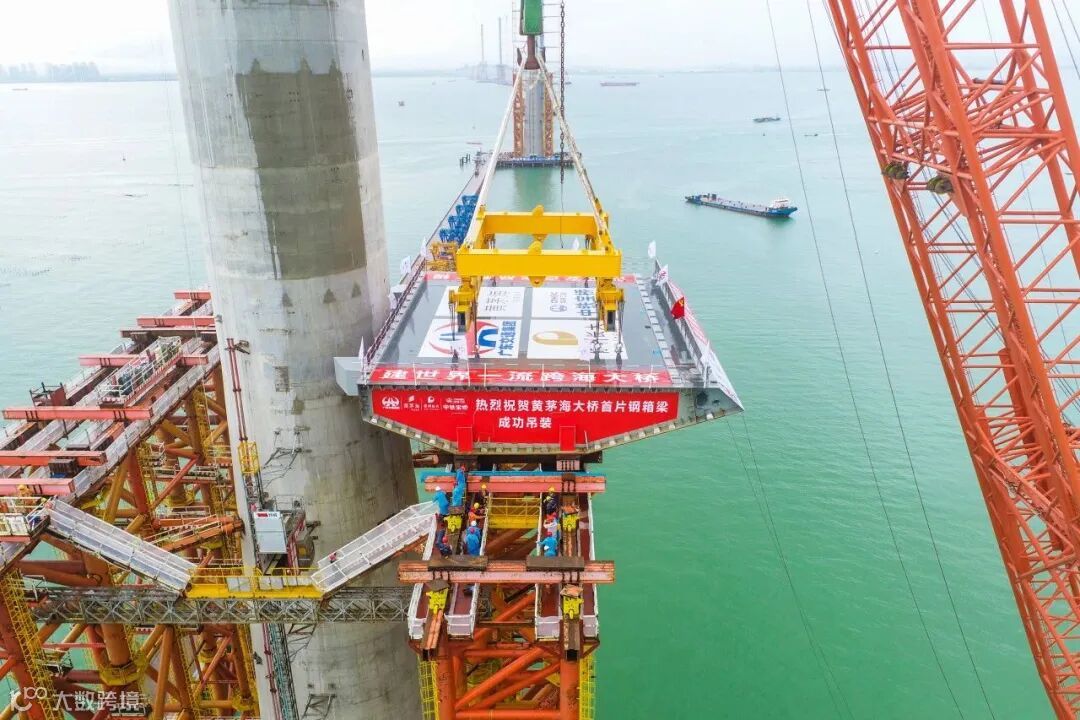 黄茅海大桥为主跨720米、全长2200米的斜拉桥,建成后将成为世界跨径最大的公路三塔斜拉桥。主梁为分体式钢箱梁,由两个钢箱梁及横向连接箱组成,共划分为16种、149个制造梁段。此次吊装的首片钢箱梁重量约355吨,重量与80头成年大象相当。