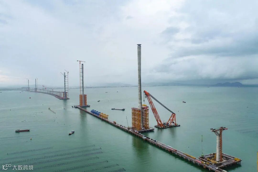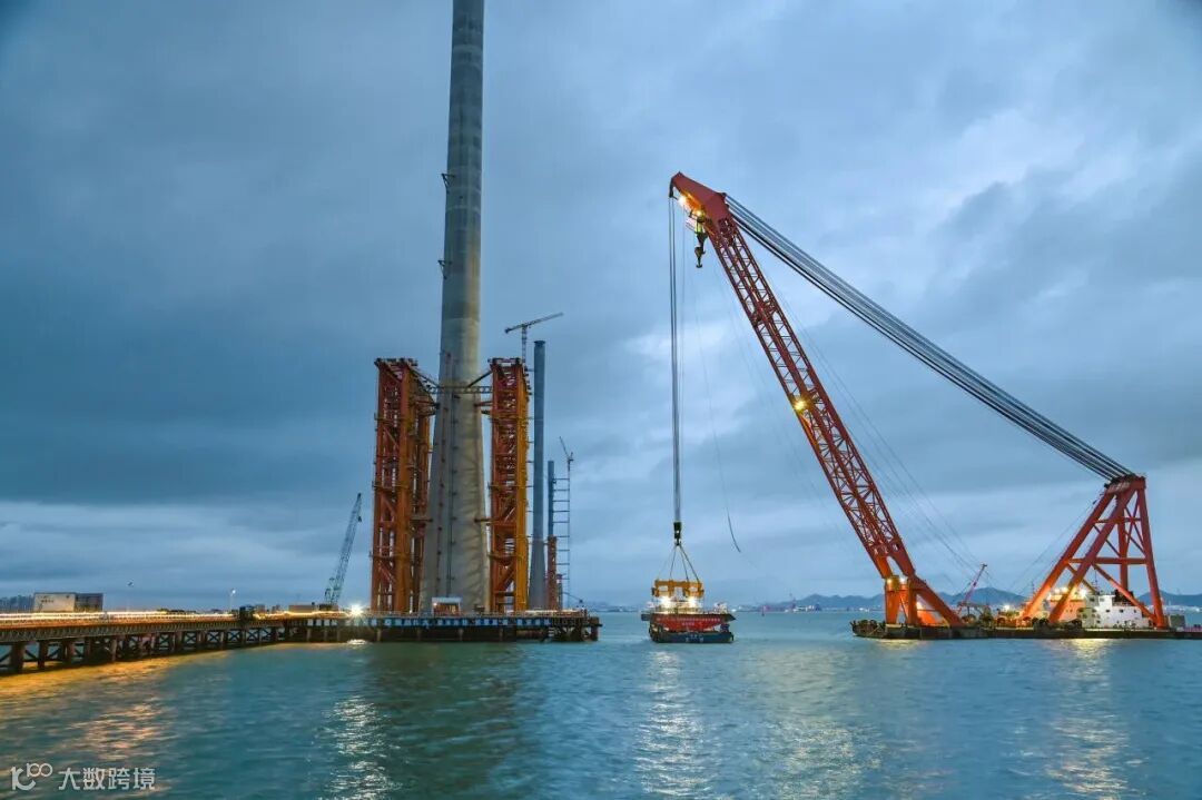 黄茅海大桥全桥采用全漂浮体系,索塔处不设置竖向支座。其中,大桥中西塔塔区支架为全线最高支架,净空高度达64米,钢管桩入土近40米,支架总长度超过100米。