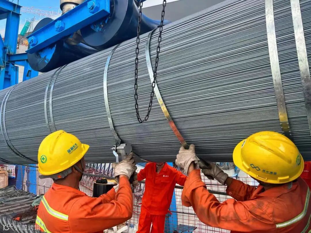 主缆是悬索桥的主要受力构件,有着悬索桥“脊梁”之称。深中通道伶仃洋大桥单根主缆由199根通长索股组成,每根索股由127丝、直径为6.00毫米的国产自主研发2060兆帕的锌铝合金镀层高强钢丝组成,长约3公里、重约90吨,可承担极限拉力高达740吨,是目前国内强度等级最高的悬索桥主缆钢丝。