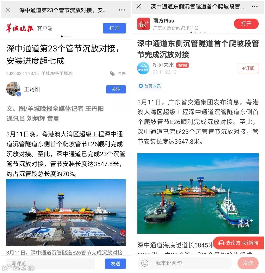 3月11日,保利长大承建的粤港澳大湾区超级工程——深中通道沉管隧道东侧首个爬坡管节E26顺利完成沉放对接,至此,深中通道已完成23个沉管管节沉放对接,管节安装长度达3547.8米。