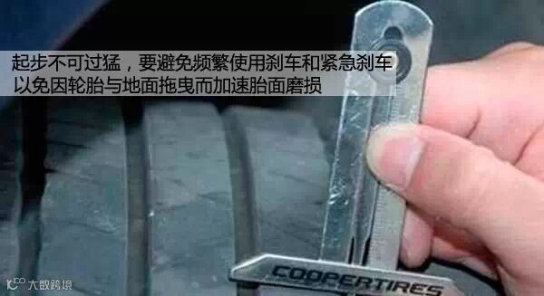 起步不可过猛,要避免频繁使用刹车和紧急刹车,以免因轮胎与地面拖曳而加速胎面磨损;在拐弯会车、超车、通过交叉路口、狭窄路面、铁路道口等地段时,应掌握适当的车速且要注意路面、行人、车辆动态,做好制动准备,减少频繁制动,避免紧急制动,从而降低轮胎磨损;面临无法避开的碎玻璃或其他异物时,要减速通过,千万不要急刹车,因为急刹车造成压强增大,玻璃碎片和异物更容易扎入轮胎。