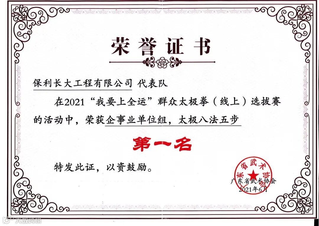 保利长大在致力于交通基础设施建设的同时,积极推进“全民健身”计划。保利长大太极队年龄覆盖60后至00后,在上一届全运会太极拳冠军、非遗陈氏太极拳嫡传人陈娟老师的教授下,苦练功夫、精雕细节、挑战体能,26天内开展了198小时集训,使整体展演呈现出飘逸中有整体、腾挪中保整齐的最佳状态。他们在超级工程深中通道伶仃洋大桥为海上施工平台建设者展演太极拳(八法五步)的视频得到中宣部《学习强国》平台转载。