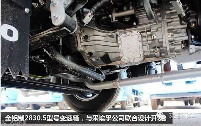 5挡手动变速器,档位清晰。变速箱为全铝制2830.5型号,由南京依维柯与采埃孚公司联合设计开发,与索菲姆发动机搭配组成高性能低排放的传动组合,动力强劲。前后桥可承载2.3吨和3.7吨,主减速比5.375。