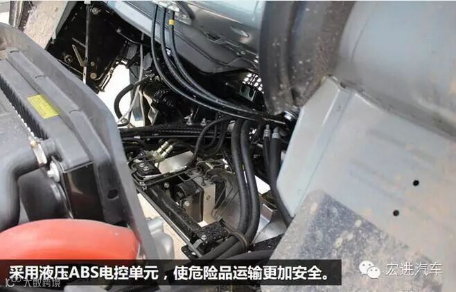 前盘后鼓,后桥带有液压ABS电控单元,后期驾驶室顶部还会加危险品运输标示。采埃孚转向器,采用南京依维柯技术,ZF技术助力转向。本车还未装行车记录仪,限速装置通过调程序实现,使限速不超过80KM/h,上牌前会加装该设备。