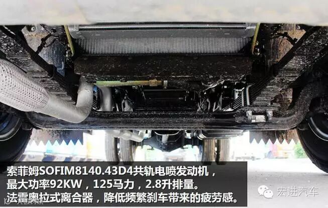 采用索菲姆发动机,SOFIM8140.43D4型号,国四排放标准,引进依维柯i-tech先进技术。采用共轨电喷系统,发动机振动噪音较小,整车舒适性得到提升。此发动机最大功率92KW,125马力,2.8L排量,最大扭矩320N.m。配置了法雷奥拉式离合器,液压助力式离合器,可以减轻行驶过程中频繁踩刹车带来的疲劳感。