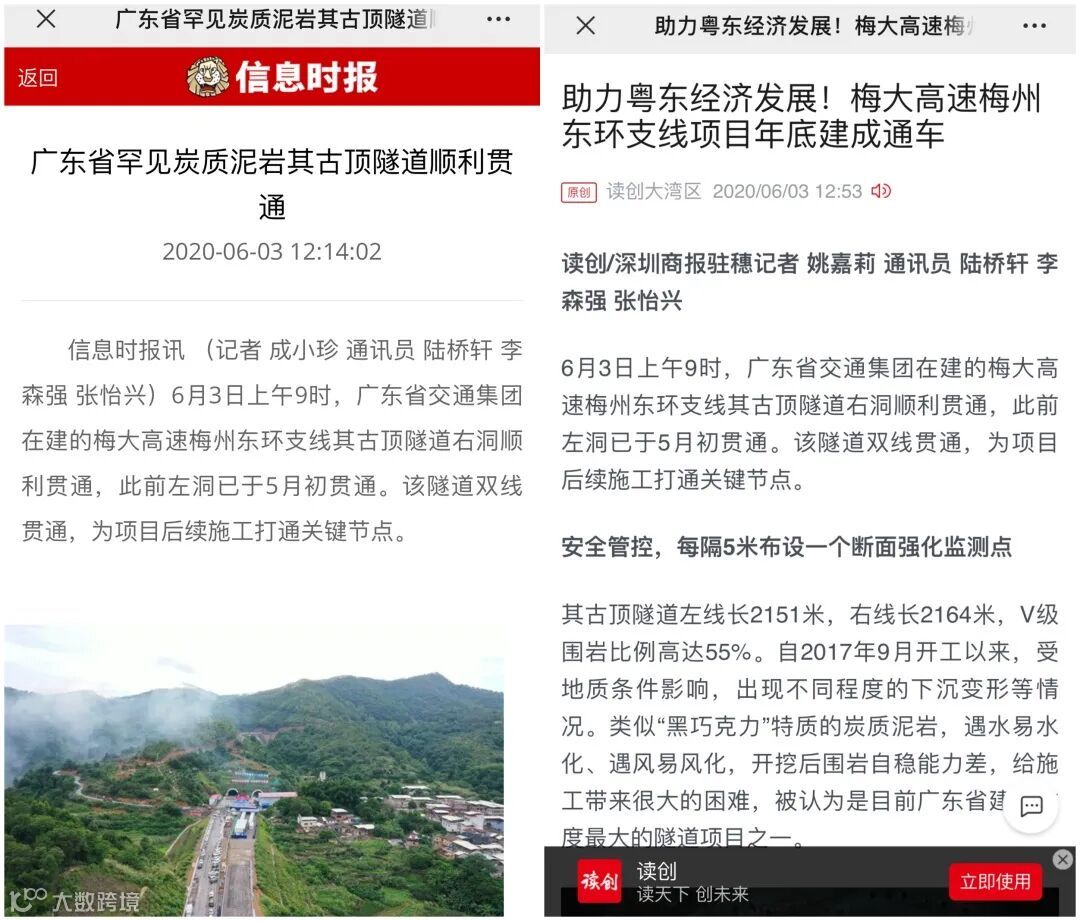 6月3日上午9时,由保利长大承建的梅大高速梅州东环支线项目其古顶隧道右洞顺利贯通,此前左洞已于5月初贯通。该隧道双线贯通,为项目后续施工打通关键节点。