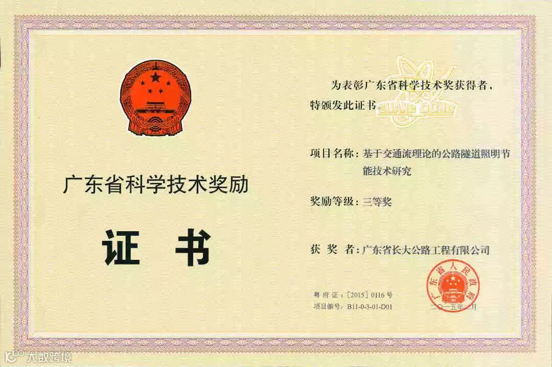 保利长大主要创新成就为“高速公路大规模隧道群通风照明环境保障技术”“复杂地形地质环境隧道群失稳灾变防控技术”在广梧高速河口至平台段隧道群中的推广应用,其中,项目创新成果“基于交通流理论的公路隧道照明节能技术研究”获评广东省科学技术三等奖,项目同时也获评第十三届中国土木工程詹天佑奖,产生良好的社会效益与经济效益。