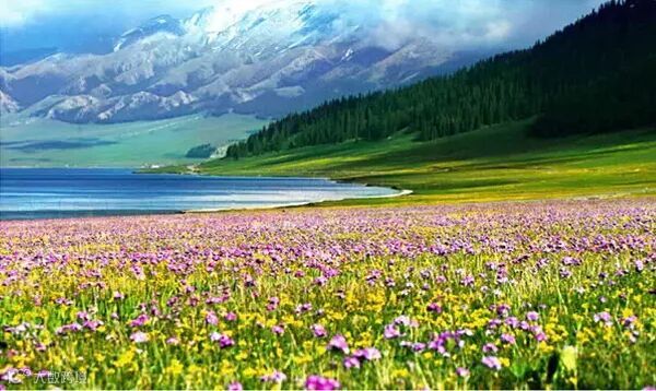 赛里木湖背靠雪山,湖边是广阔的草原,即使你看过了喀纳斯湖、西藏的纳木错,初见赛里木湖时,也会被它的美所惊艳艳。每年5月赛里木湖的冰雪渐渐消融,变为湛蓝的湖面,西海岸的五颜六色的野花相继绽放,此时的赛里木湖就是人人向往的仙境。