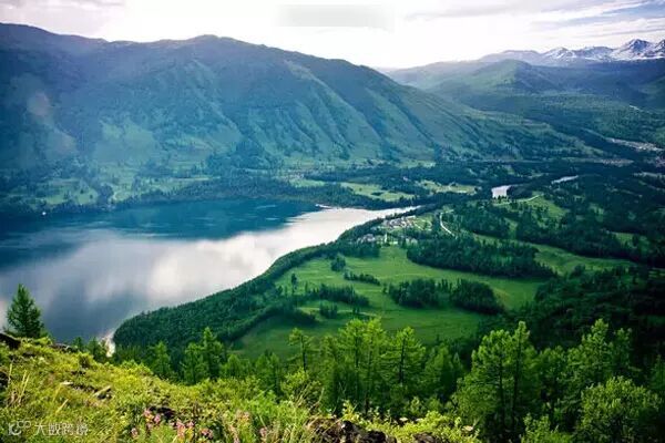 喀纳斯的水在不同的季节呈现出不同的色彩。5月的湖水,冰雪消融,湖水幽暗,呈青灰色;到了6月,湖水随周山的植物泛绿,呈浅绿或碧蓝色。湖畔遍地的花朵,天空飘散着淡淡的薄雾,恍若置身仙境。