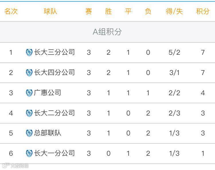 三分公司、四分公司均取得赛事的第二场胜利,在积分榜上同积7分。总部联队取得赛事首胜,在积分榜上积3分。