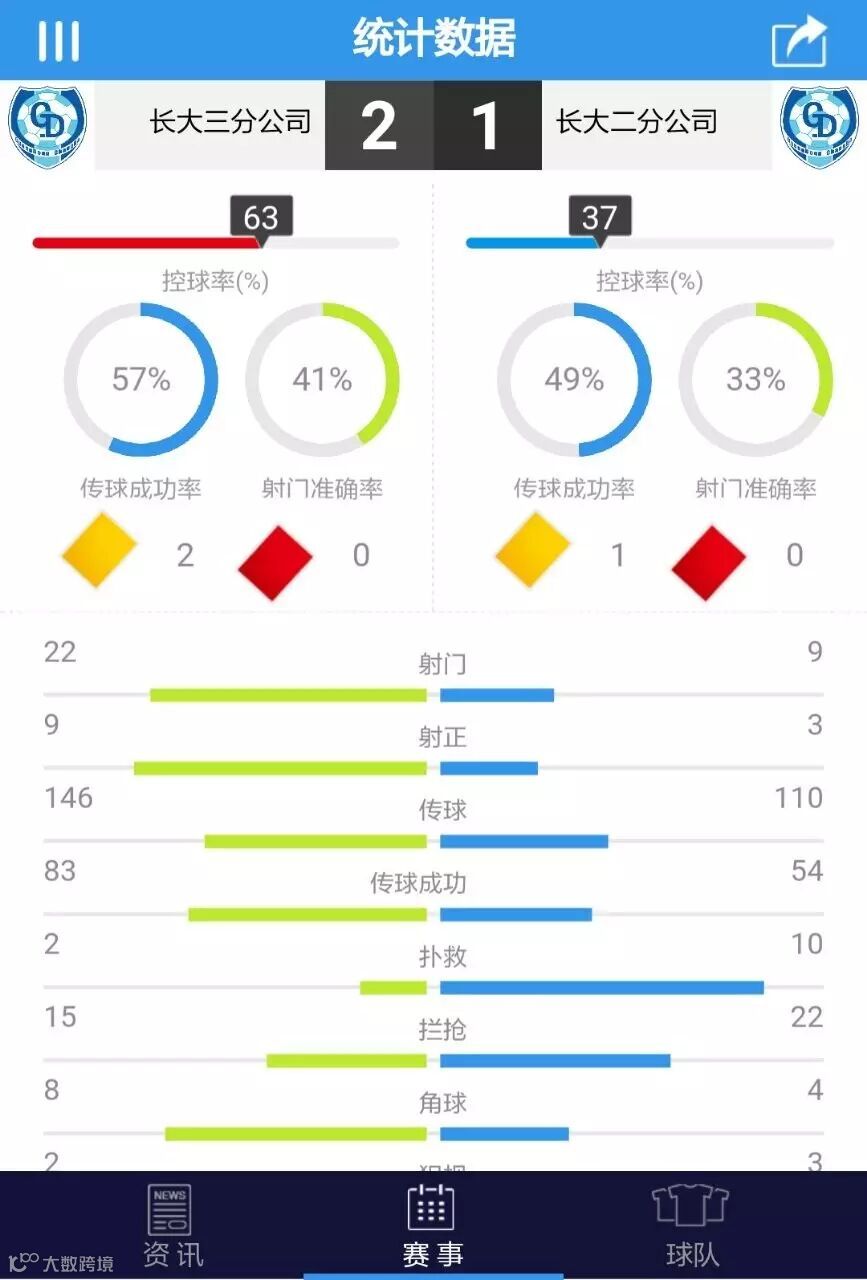 同时进行的长大二分公司和长大三分公司的比赛则是一场精彩的逆转好戏。上午10点,随着裁判一声哨响,比赛正式拉开帷幕。开场仅仅两分钟,身穿红色球衣的二分公司就取得了领先。二分公司在通过几次中后场倒脚后,由23号何锦俊一脚大范围转移到禁区前沿。三位前锋反越位成功,最后18号谭中光冷静推射得手,1:0。比分落后的三分公司开始展开强力反扑,频频利用边路突破传中制造杀机,二分公司则耐心防守,依靠队中王牌前锋的速度打反击。双方展开了精彩的攻防大战。12分钟三分公司17号球员张雄文禁区突施冷箭,皮球撞柱而出; 18分钟二分公司抓住对手失误打反击,18号球员谭中光接队友长传转移给中路的20号球员吴春秋,后者利用个人能力摆脱调整后射门,又是擦着立柱出了底线。二分公司把领先优势保持到了下半场。