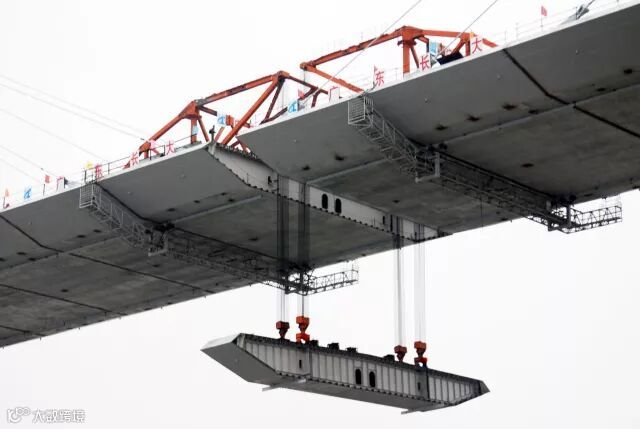 2007年2月6日北航道桥首段钢箱梁吊装到位。