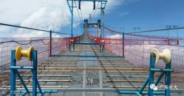6月16日,坭洲水道桥两根总长度分别为2000米、重达分别为8吨多的先导索成功跨越珠江,大桥建设正式进入上部构造阶段。因上部构造施工所需,要在番禺、东莞两个锚碇之间搭建一条长3000米的钢索便桥。6月16日到9月15日,项目部在三个月合理组织施工,搭建出最长高空施工便道。8月15日,24根直径54毫米的猫道承重绳在星夜兼程中成功架设。8月底,正值猫道面网铺设高风险关键时期,最强台风“天鸽”、“卡帕”相继来袭,项目部做足防台措施,安然度过台风期。随后通过科学组织,在边中跨平衡、上下对称、多工作面同步作业下,仅用7天时间就完成了猫道面网铺设,相当于1天铺设430米左右,创下又一个建桥记录。