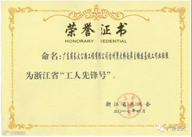 广东省长大公路工程有限公司台州湾大桥及接线工程TS09标南岸主墩桩基施工作业班组及TS15标燕山隧道施工班组为完成“两美”浙江重点工程劳动立功竞赛活动作出了积极贡献,被授予浙江省“工人先锋号”荣誉称号。