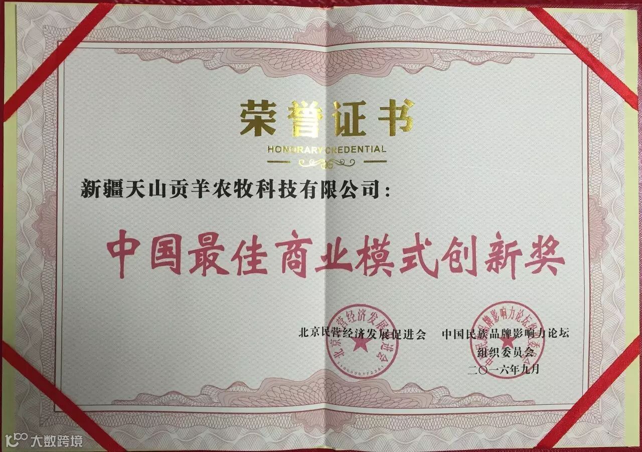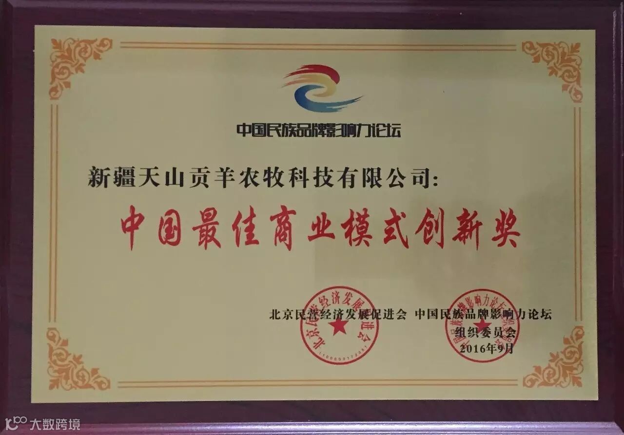 2016年9月,新疆天山贡羊农牧科技有限公司荣获由北京民营经济发展促进会、中国民族品牌影响力论坛组织委员会颁发的“中国最佳商业模式创新奖”。