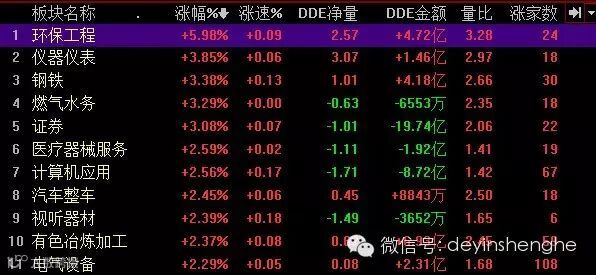 板块上, 环保工程、仪器仪表、钢铁和燃气水务领涨,其中环保工程涨6%。博世科、国电清新、三维丝涨停。