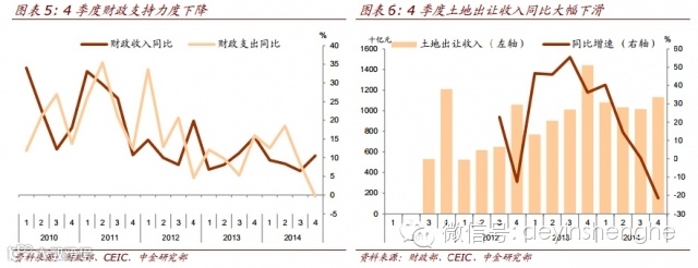 l 4季度财政紧缩力度较大,将对1季度内需带来不利影响。去年4季度财政收入增速上升,支出增速下降(图表5),财政赤字1.4万亿,较2013年同期1.75万亿大幅减少。并且4季度土地出让收入增速同比下跌21.5%(图表6),支出增速同比下跌20.1%,去年房地产市场疲弱对土地财政的紧缩效果开始显现。4季度财政支持力度下降将对1季度内需尤其是基建投资资金来源带来不利影响。