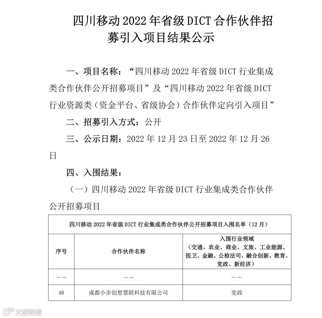 近日,中国移动通信集团四川有限公司2022年省级DICT行业集成类合作伙伴入围名单公布,小步创想凭借在数字政府领域的技术创新和实力沉淀成功入围。