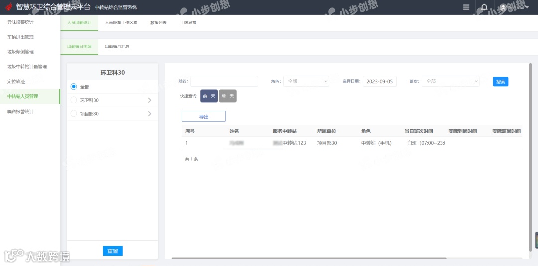 为中转站工作人员配备智能穿戴设备,不仅对工作人员上下班的考勤进行监管,防止其迟到早退,也对人员的工作轨迹进行记录,一旦脱离工作区域系统会自动报警,实现人员自动化监督管理,确保垃圾及时清运,清运后及时消杀,为市民提供更加良好的生活环境。