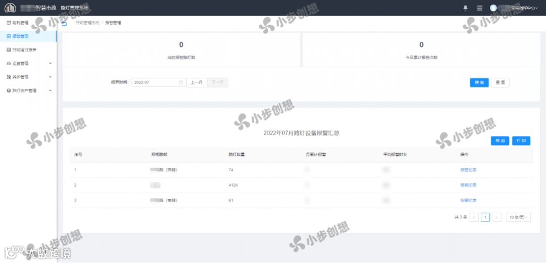 在照明控制监测的基础上,通过照明报警管理,就可对设备的电路运行状态进行全天候监测。当控制设备监测到路灯状态异常时,系统会自动告警,平台收到报警信息后,自动指派相关养护人员及时前往现场核查检修,确保问题及时解决。