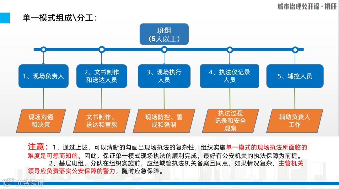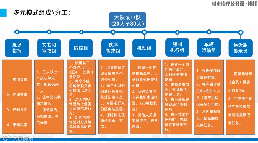 比较复杂、比较重大的执法现场,比如拆除违法建筑或者大型集中整治,可能会去20人,这种情形下,就需要分组,包括指挥、文书、宣教、防控等等。