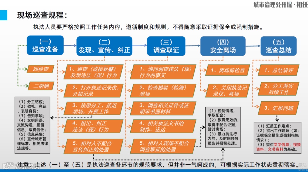 这1-5个现场巡查规程并不是每个都必须要有,这只是相对完整的现场执法巡查流程。如果确实没有,比如当事人他没有违法行为或者他配合你,那就不需要考虑当事人不配合情况下我们的工作。