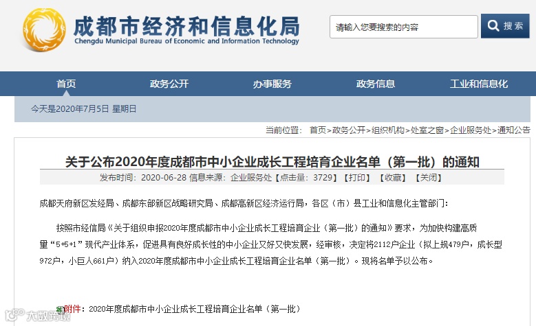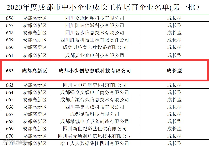 近日,成都市经济和信息化局对外发布了《2020年度成都市中小企业成长工程培育企业名单(第一批)》,成都小步创想慧联科技有限公司(简称“小步创想”)成功入选为成长型企业,同数之联、中通服科技、卓源科技、智元汇、傲视科技、创立科技、四方伟业等优秀的企业共同成为成都市的重点培育对象。