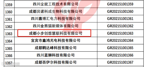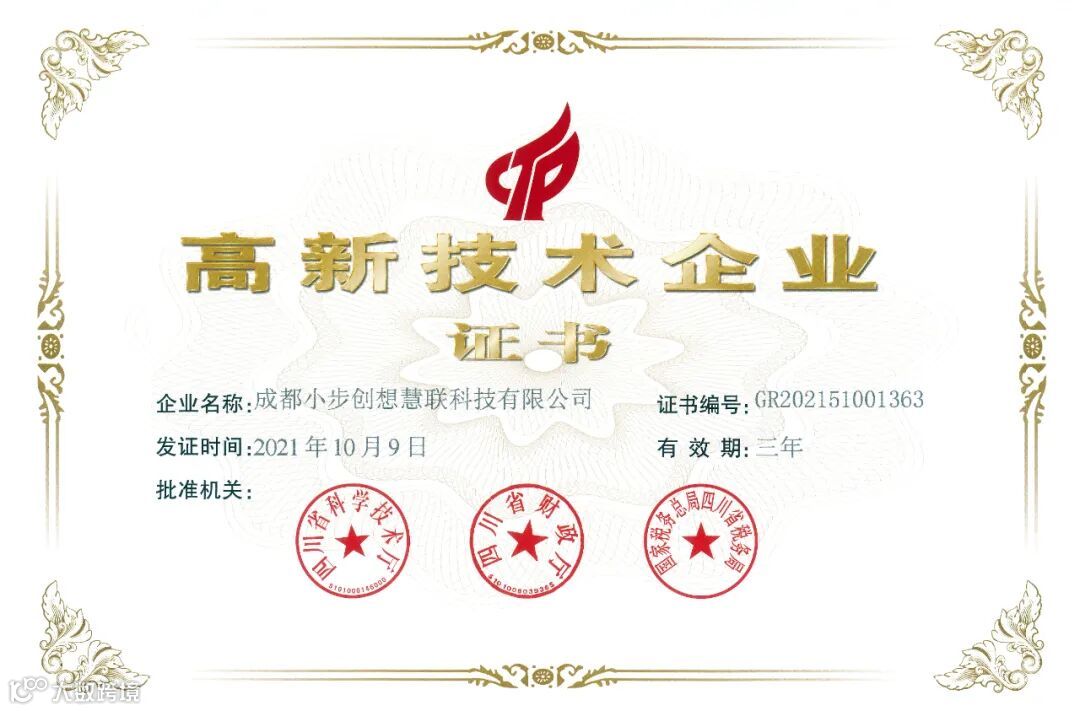 近日,科技部火炬中心公示了《四川省2021年第一批备案高新技术企业名单》,小步创想荣膺国家“高新技术企业”称号。